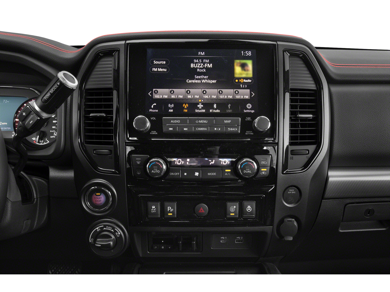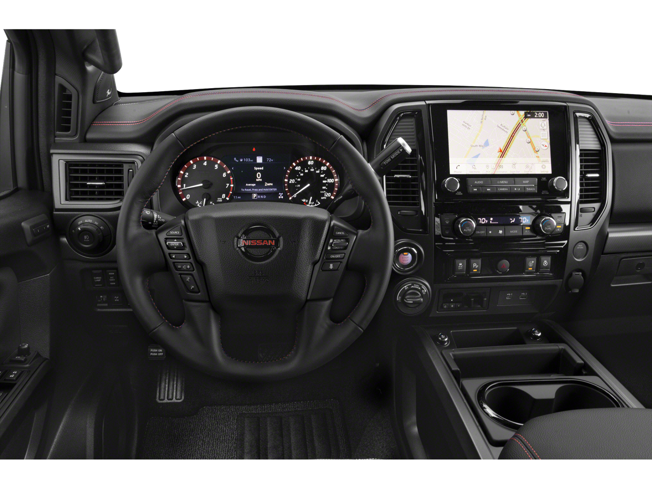 This Titan PRO-4X is equipped with a wealth of premium features that elevate your driving experience. Enjoy the convenience of the NissanConnect Navigation system, the exceptional clarity of the Fender Premium Audio System, and the added utility of the 110V outlet in the bed. Stay connected and comfortable with features like Remote Engine Start, Heated Rear Seats, and the Memory Driver Seat.