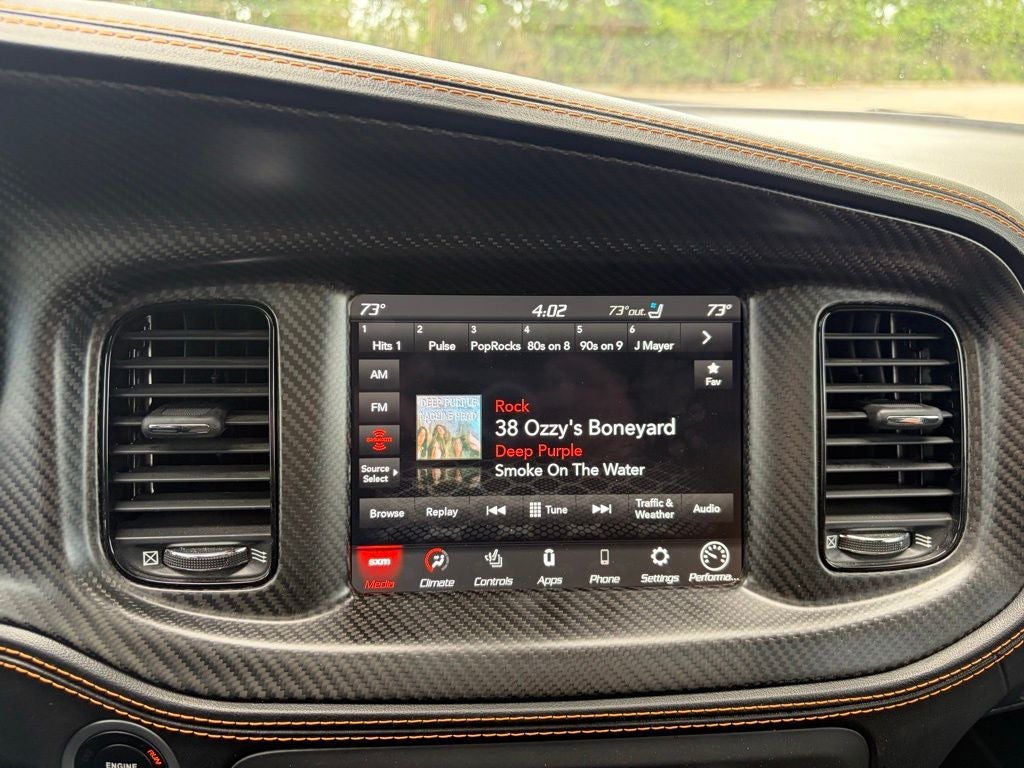 Carbon/Suede Interior Package (Real Carbon Fiber Interior Accents and Suede Headliner), Driver Convenience Group (Bi-Function HID Projector Head Lamps), harman/kardon Audio Group (19 harman/kardon GreenEdge Speakers, harman/kardon GreenEdge Amp, and Surround Sound), HEMI Orange Package (392 Fender Badge, 392 IP Badge, Black Stripe w/Orange Tracer, Brake Calipers - Orange, Flat-Bottom Steering Wheel, Gloss Black I/P Cluster Trim Rings, Heated 2nd Row Seats, Heated Front Seats, HEMI Orange Badges, Illuminated Rear Cupholders, Nappa/Alcantara Seats // Logo, Orange Interior Accent Stitch, Power 2-Way Driver Lumbar Adjust, Power 2-Way Passenger Lumbar Adjust, Power Front Driver/Passenger Seats, Premium-Stitched Dash Panel, Radio/Driver Seat/Mirrors Memory, Rear Seat Armrest w/Storage Cupholder, Satin Black Dodge Tail Lamp Badge, Ventilated Front Seats, and Wheels: 20 x 11 Carbon Black Warp Speed), Mopar Interior Appearance Group (Mopar Bright Door Sills, MOPAR Premium Floor Mats w/Logo, and Trunk Mat w/Logo), Plus Group (Auto Adjust In Reverse Exterior Mirrors, Auto-Dimming Exterior Driver Mirror, Black-Edged Premium Floormats, Blind Spot & Cross Path Detection, Blind Spot Memory/Power/Heat Mirror, Body Color Exterior Mirrors, Driver & Passenger Lower LED Lamps, Exterior Mirrors Courtesy Lamps, Exterior Mirrors w/Heating Element, Front Overhead LED Lighting, Power Tilt/Telescope Steering Column, and Scat Pack Logo Nappa/Alcantara Seat), Quick Order Package 21V Scat Pack Widebody (Adaptive Damping Suspension, All Speed Traction Control, Body Color Fender Flares, Brembo 6-Pot Fixed Front Caliper Brakes, Performance Shift Indicator, Rhombi 2-Pc Wheel Center Cap, and Widebody Competition Suspension), Widebody Package, Black Artificial Leather, 4-Wheel Disc Brakes, 6 Speakers, ABS brakes, Air Conditioning, Alloy wheels, AM/FM radio: SiriusXM, Anti-whiplash front head restraints, Apple CarPlay, Apple CarPlay/Android Auto, Auto-dimming Rear-View mirror, Automatic temperature control, Brake assist, Bumpers: body-color, Cloth Performance Seats w/Heat, Compass, Delay-off headlights, Driver door bin, Driver vanity mirror, Dual front impact airbags, Dual front side impact airbags, Electronic Stability Control, Emergency communication system: SiriusXM Guardian, Four wheel independent suspension, Front anti-roll bar, Front Bucket Seats, Front Center Armrest, Front dual zone A/C, Front fog lights, Front License Plate Bracket, Front reading lights, Fully automatic headlights, Garage door transmitter: HomeLink, Google Android Auto, GPS Antenna Input, Heated door mirrors, Heated front seats, Heated steering wheel, Illuminated entry, Integrated Center Stack Radio, Integrated Voice Command w/Bluetooth®, Knee airbag, Leather Shift Knob, Low tire pressure warning, Media Hub (2 USB, AUX), Occupant sensing airbag, Outside temperature display, Overhead airbag, Overhead console, Panic alarm, ParkView Rear Back-Up Camera, Passenger door bin, Passenger vanity mirror, Power door mirrors, Power driver seat, Power steering, Power Sunroof, Power windows, Radio: Uconnect 4C w/8.4 Display, Rear anti-roll bar, Rear reading lights, Rear seat center armrest, Rear window defroster, Remote keyless entry, Security system, Speed control, Speed-Sensitive Wipers, Split folding rear seat, Spoiler, Sport steering wheel, Steering wheel mounted audio controls, Tachometer, Telescoping steering wheel, Tilt steering wheel, Traction control, Trip computer, USB Host Flip, Variably intermittent wipers, and Wheels: 20 x 9 Lo Gloss Granite Crystal.